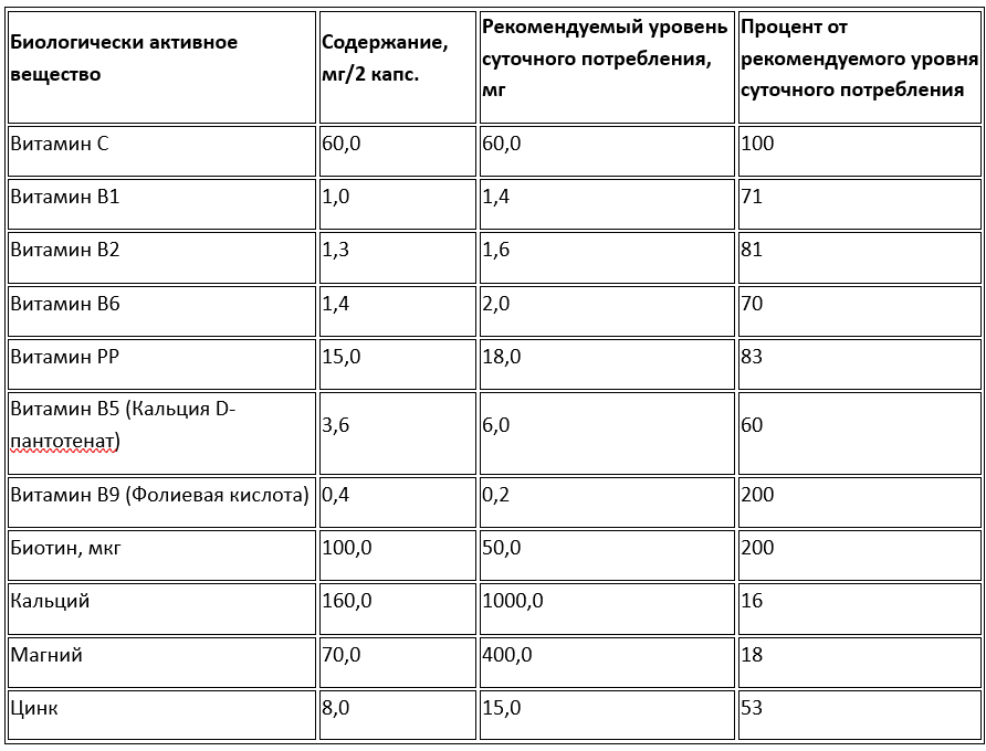 Комплекс витаминов (С, В1, В2, В6, РР, В5, В9, биотин) и минеральных веществ (цинк, кальций, магний) способствует укреплению иммунитета, повышению энергетического потенциала организма, нормализации обменных процессов, поддержанию здоровья нервной системы, улучшению состояния кожи, волос и ногтей, а также обеспечивает оптимальную работу всех систем организма.